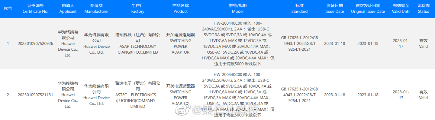 华为终端有限公司申请了一款新的手机充电器入网,型号为HW-200440C00,由博硕科技(江西)有限公司以及雅达电子(罗定)有限公司代工,支持最高20V 4.4A的88W快充,兼容之前华为主流的66W/40W快充