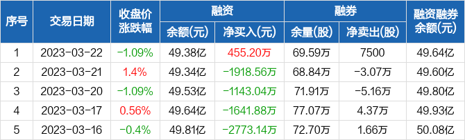 融资方面,当日融资买入5500.61万元,融资偿还5045.41万元,融资净买入455.2万元。融券方面,融券卖出3.46万股,融券偿还2.71万股,融券余量69.59万股,融券余额2589.61万元。融资融券余额合计49.64亿元。