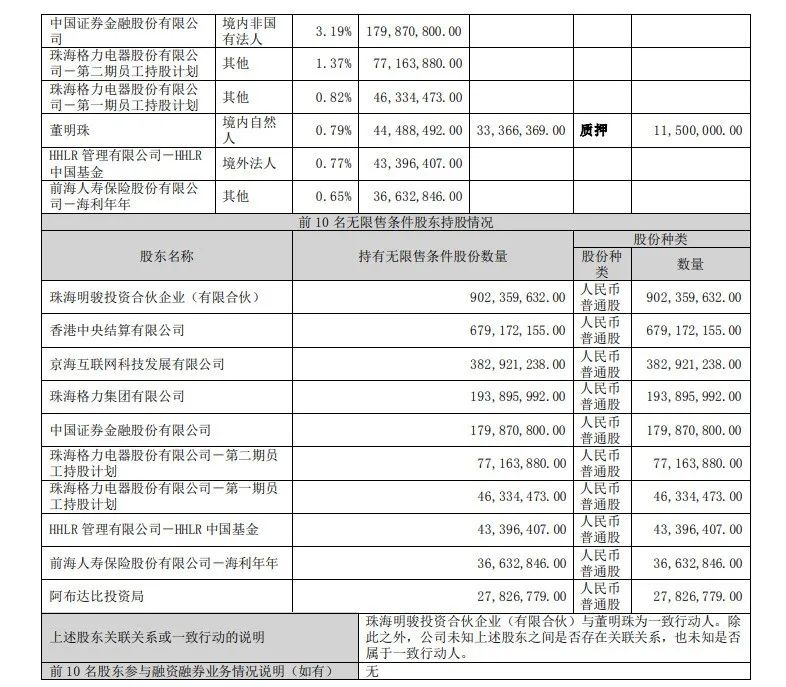 根据更正后的一季报,截至一季度末,董明珠共有1150万股处于质押状态,该部分股份市值约为4.04亿元,占董明珠所持全部格力电器股份4448.85万股的25.85%。