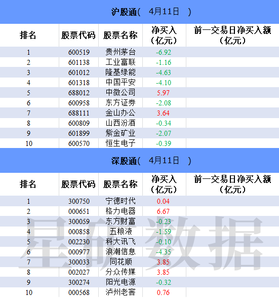 【北向资金今日净买入26.26亿元 格力电器净买入额居首】财联社4月11日电,北向资金今日净买入26.26亿元。格力电器、中微公司、同花顺分别获净买入6.67亿元、5.97亿元、3.85亿元。贵州茅台净卖出额居首,金额为6.92亿元。