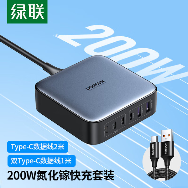 绿联闪充湃200W氮化镓充电器套装+6AType-C数据线2米*1通用Macbook/ipadpro苹果华为Type-C笔记本电脑手机498.9元京东去购买