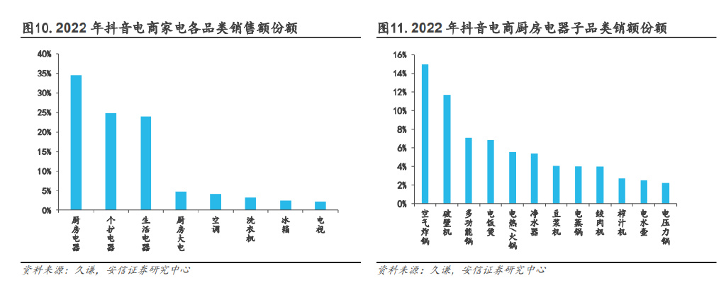 根据久谦数据的报告,2022年厨房小家电、个护电器和生活电器占抖音家电品类销售额的比例均超过20%,比传统白电、黑电更受欢迎。在已公布销售成绩的头部品牌中,苏泊尔在抖音平台全年销售额突破9亿元,摩飞同样在抖音直播间混得风生水起。