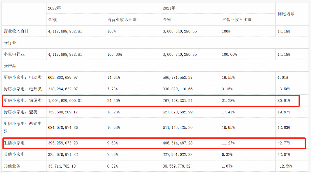 在财报中,小熊电器将其营收版图拆分为厨房小家电、生活小家电、其他小家电和其他业务,厨房小家电又根据品类拆分为电动类、锅煲类、壶类和西式电器类。这当中,厨房小家电仍是小熊电器主要收入来源,全年营收占比超过80%。