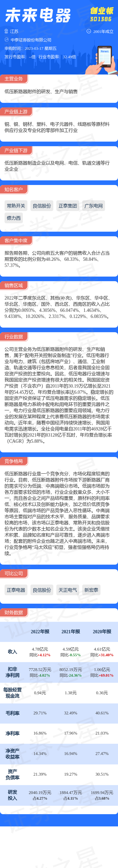 未来电器3月17日网上申购,申购代码为301386,中签号公布日期为3月21日。该股概况请见下图: