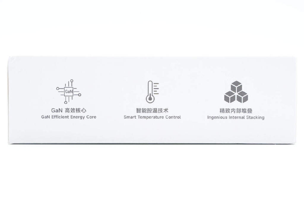包装盒侧面印有GaN高效核心,智能控温技术和精致内部堆叠字样。