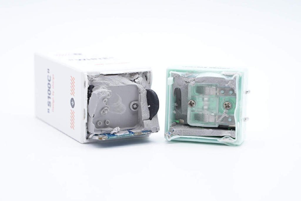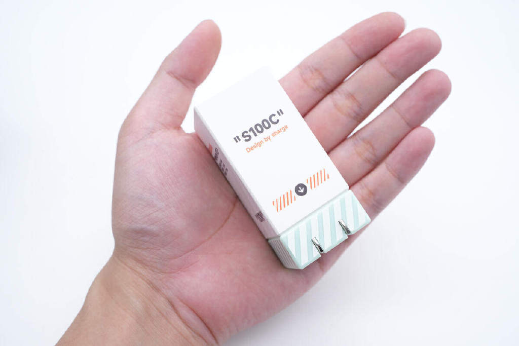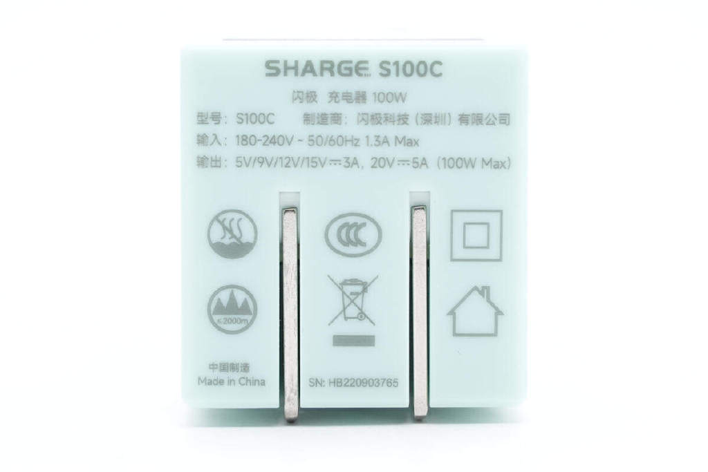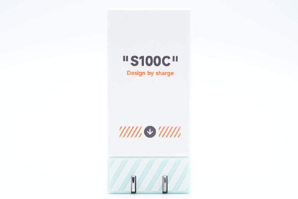 腰身一面印有S100C型号,向下箭头指示折叠插脚。
