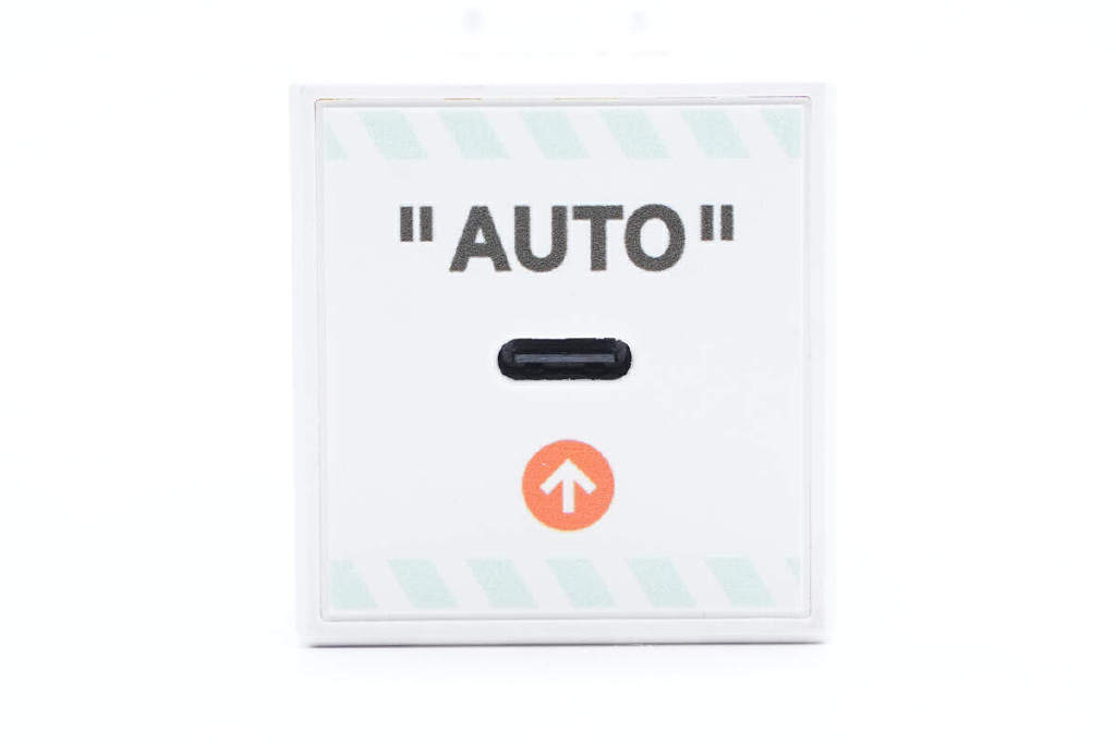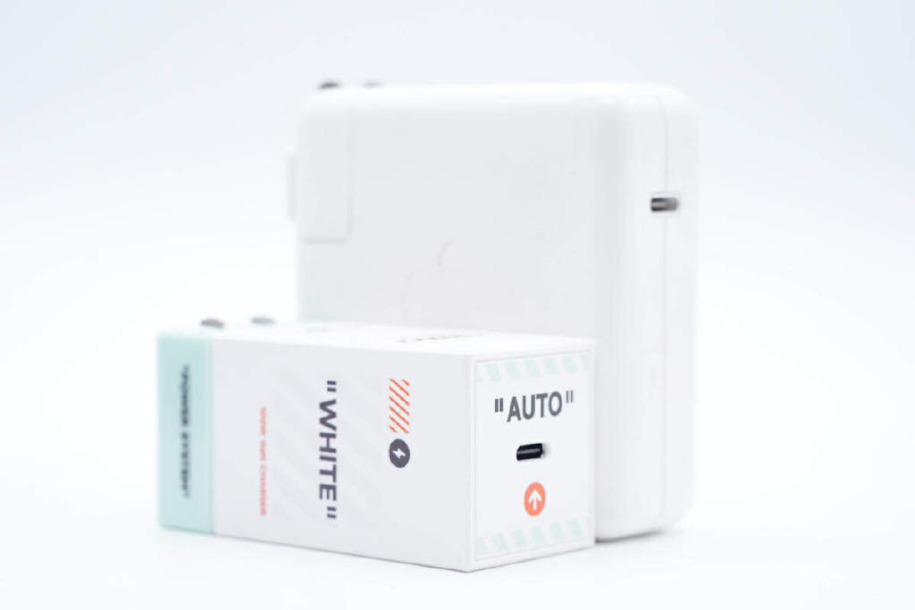 输出侧接口一览,标注AUTO和红色箭头。充电器为单USB-C输出口。