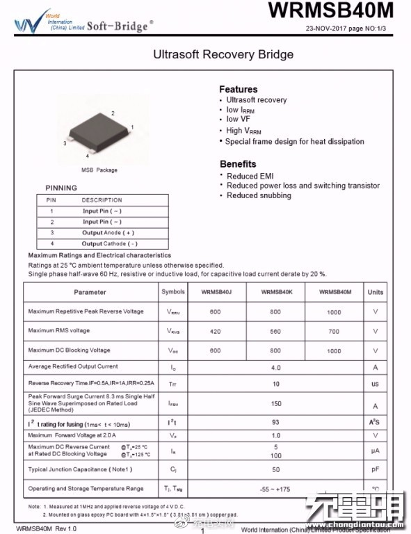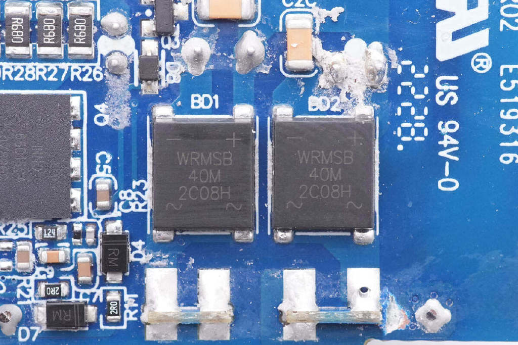 PCB背面焊接两颗WRMSB40M整流桥,两颗整流桥半桥连接,均摊发热降低温升。WRMSB40M来自深圳市沃尔德实业有限公司,这颗软桥通过较软的恢复曲线,比较平滑的关断特性,可以降低二极管结电容达到非常少的谐波振荡产生的效果。