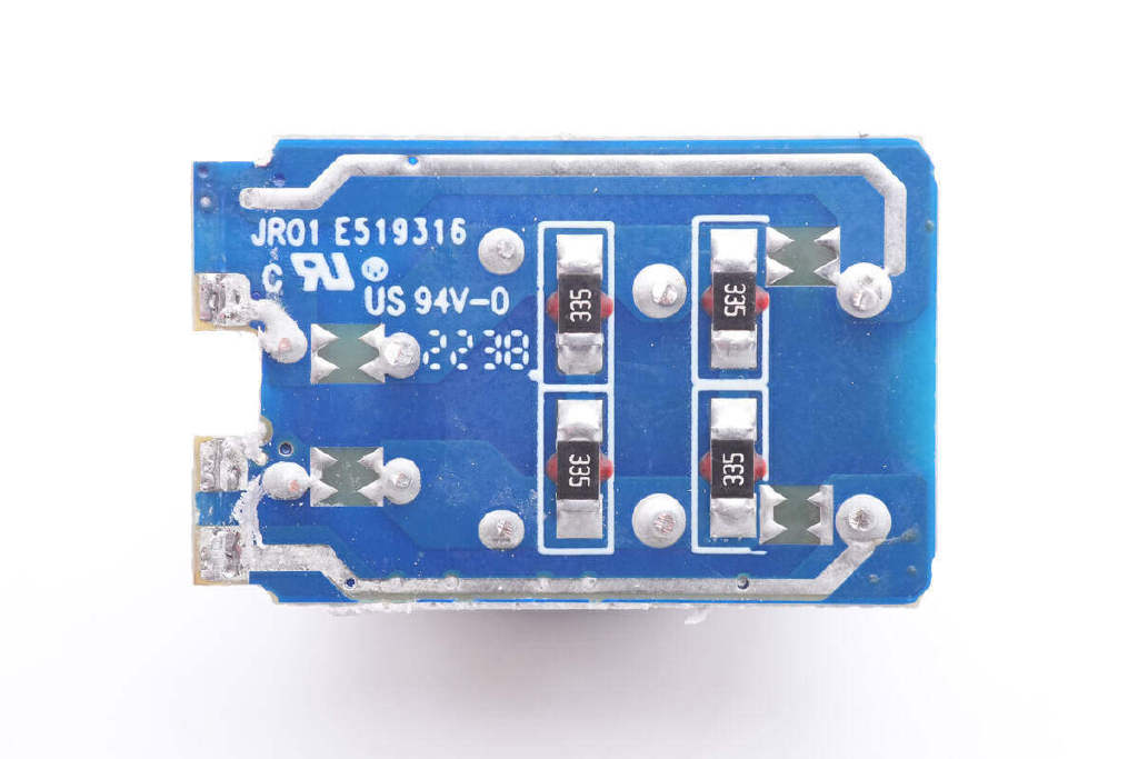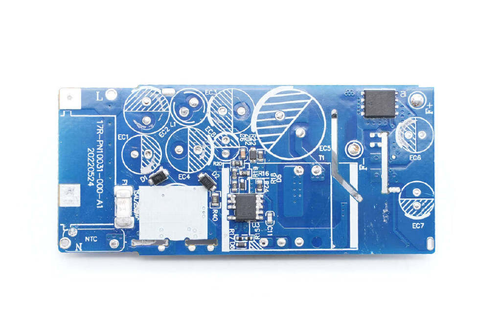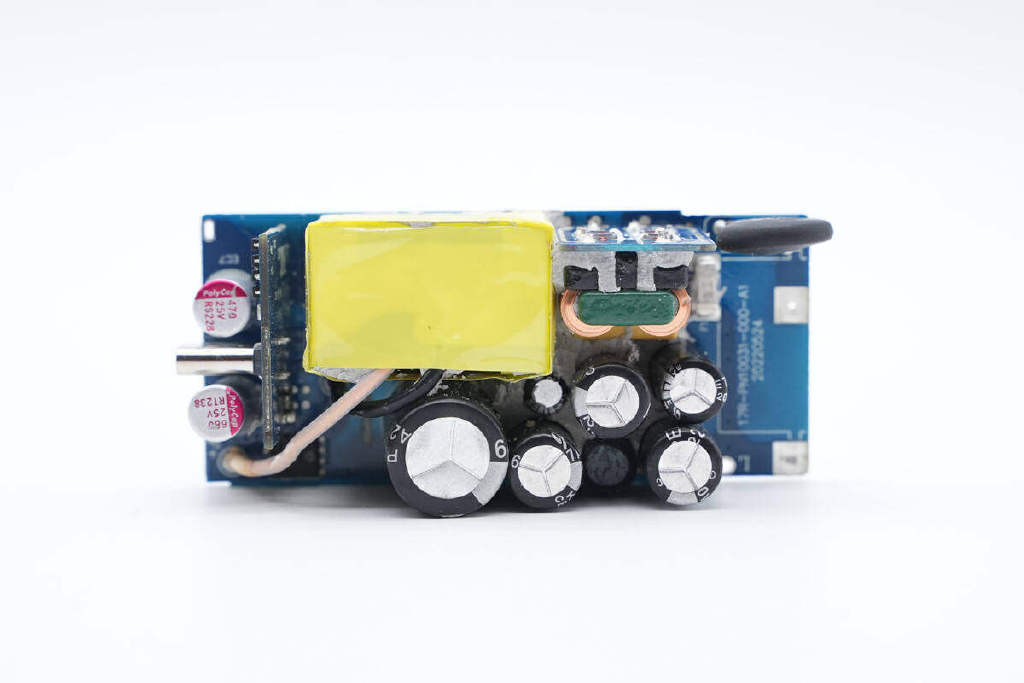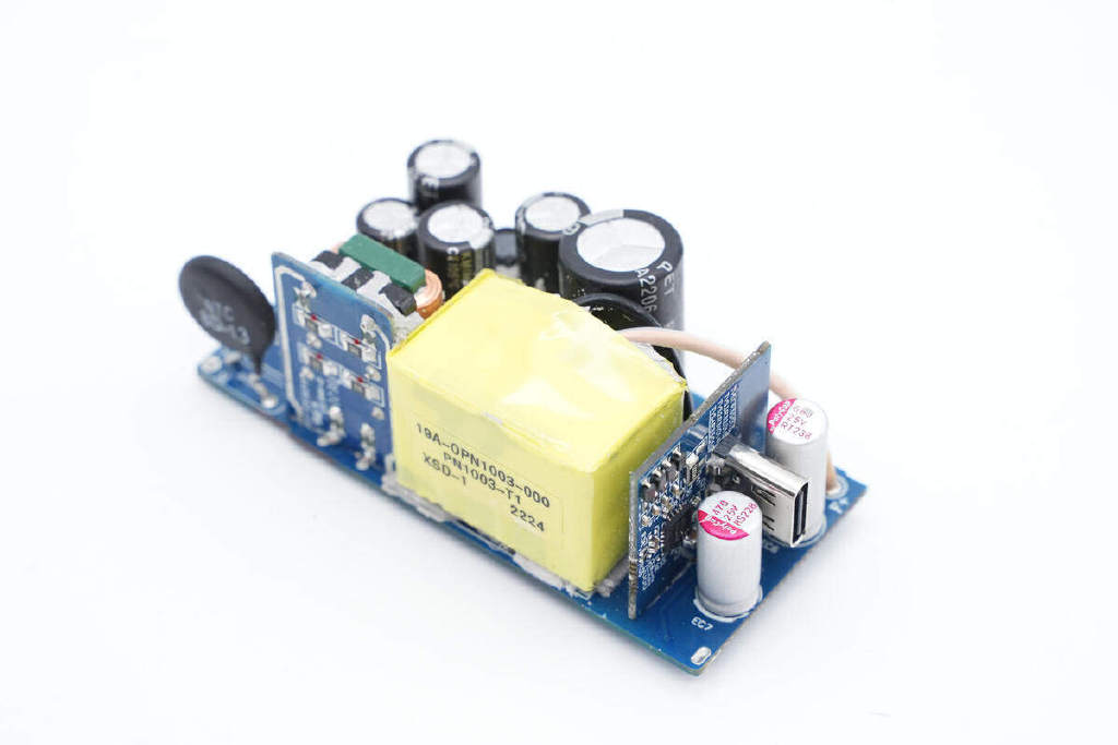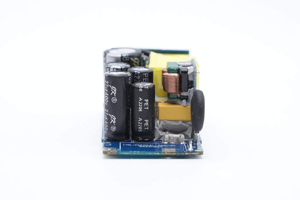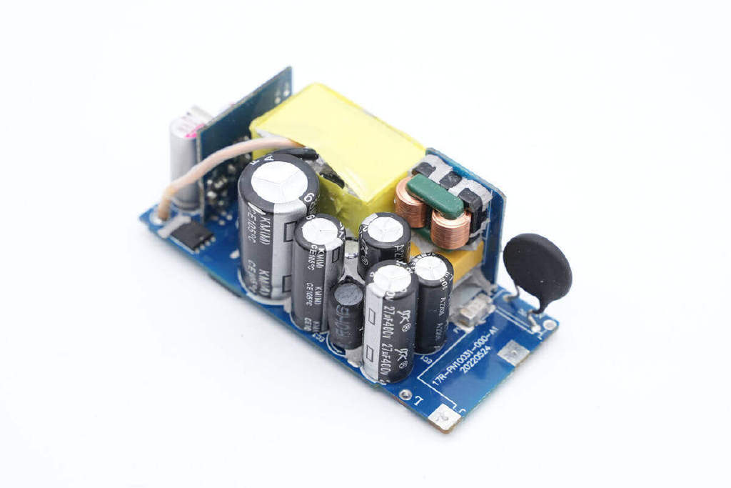清理掉PCBA模块上的灌胶,充电器内部采用三块PCB焊接组成,元器件立体布局,充分利用空间减小体积。交流输入通过插脚弹片连接到PCBA模块供电。
