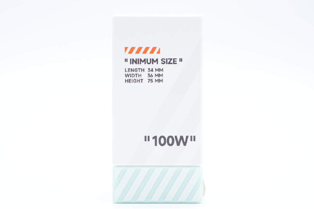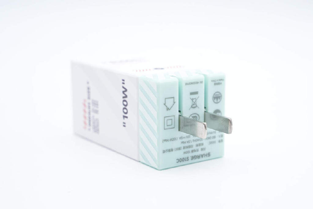 闪极这款充电器采用长条形外观设计,配有折叠插头,体积小巧,便于携带和收纳。外壳为双色设计,并印有产品型号,辨识度非常高。充电器为单USB-C接口,支持100W输出功率,并具备PPS快充,满足笔记本电脑充电和安卓手机大功率快充需求。