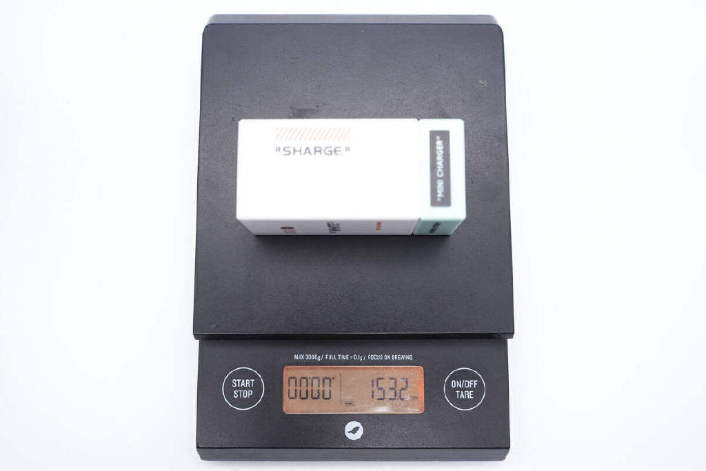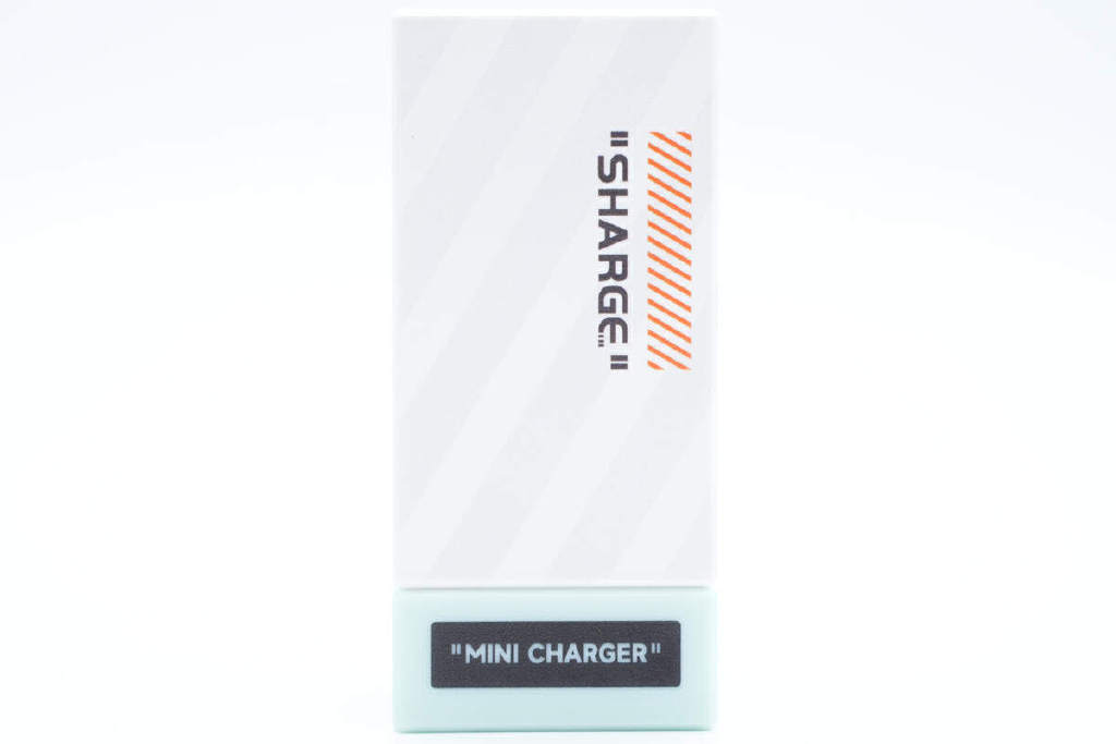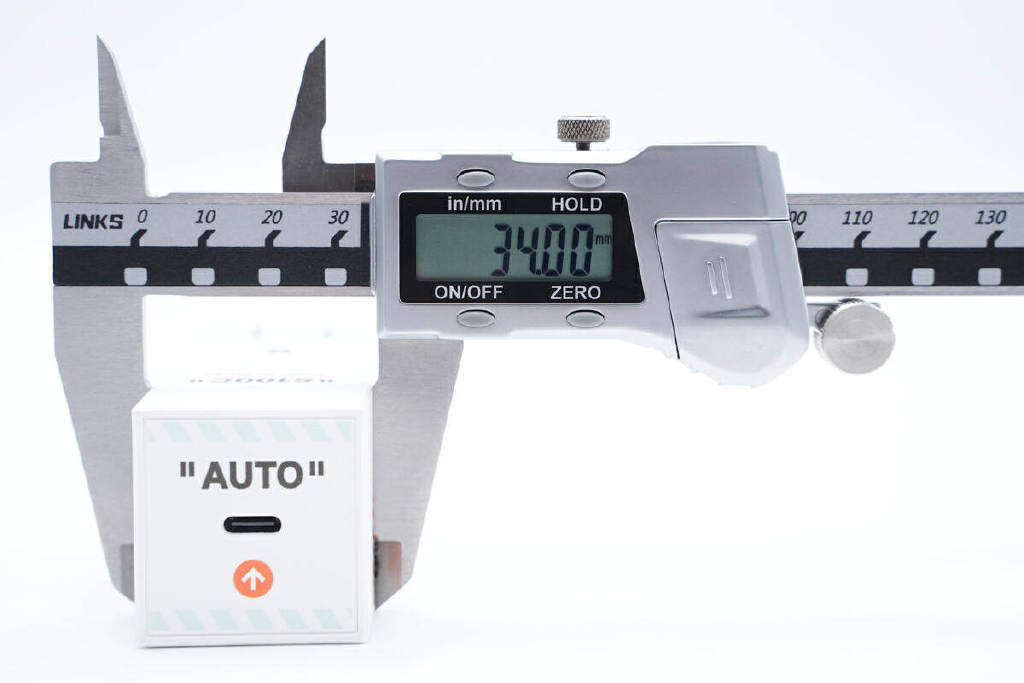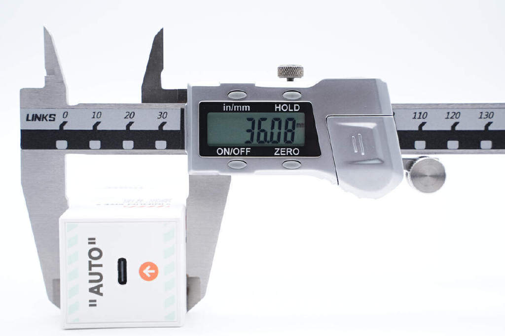 充电器采用热门的长条方柱造型设计,PC材质白色外壳,侧面印有机身尺寸和输出功率。