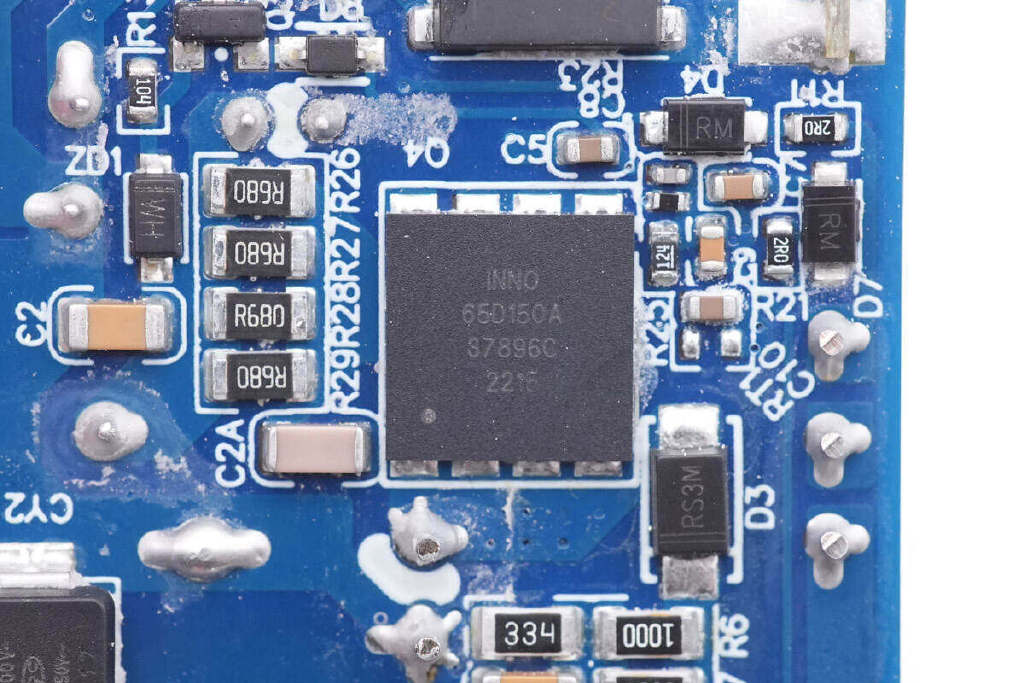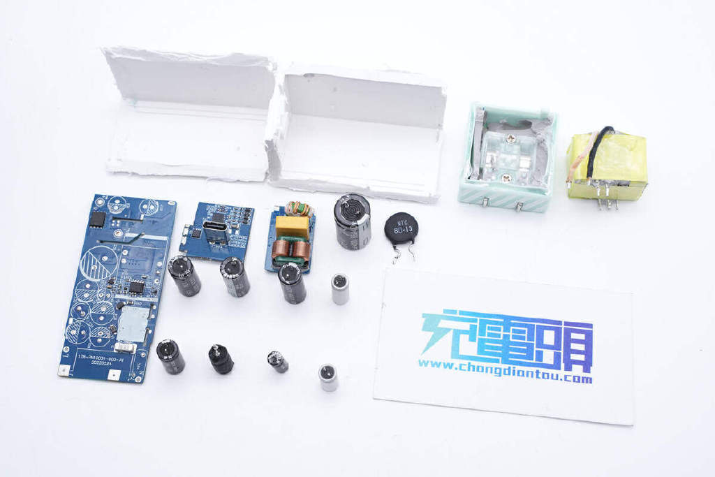 这款充电器采用多块PCB组合的方式,充分利用内部空间。内部灌胶工艺有助于提升散热性能,降低温升。内部使用氮化镓开关管,提高充电器的工作频率,很好的控制了充电器的体积和发热,提升了消费者的使用体验。