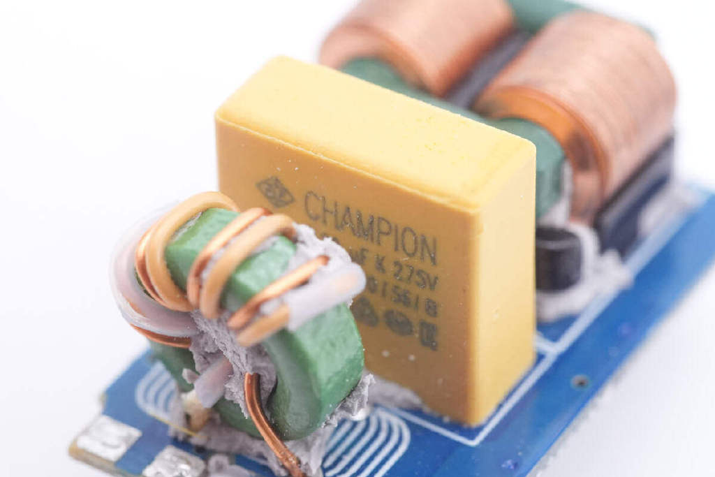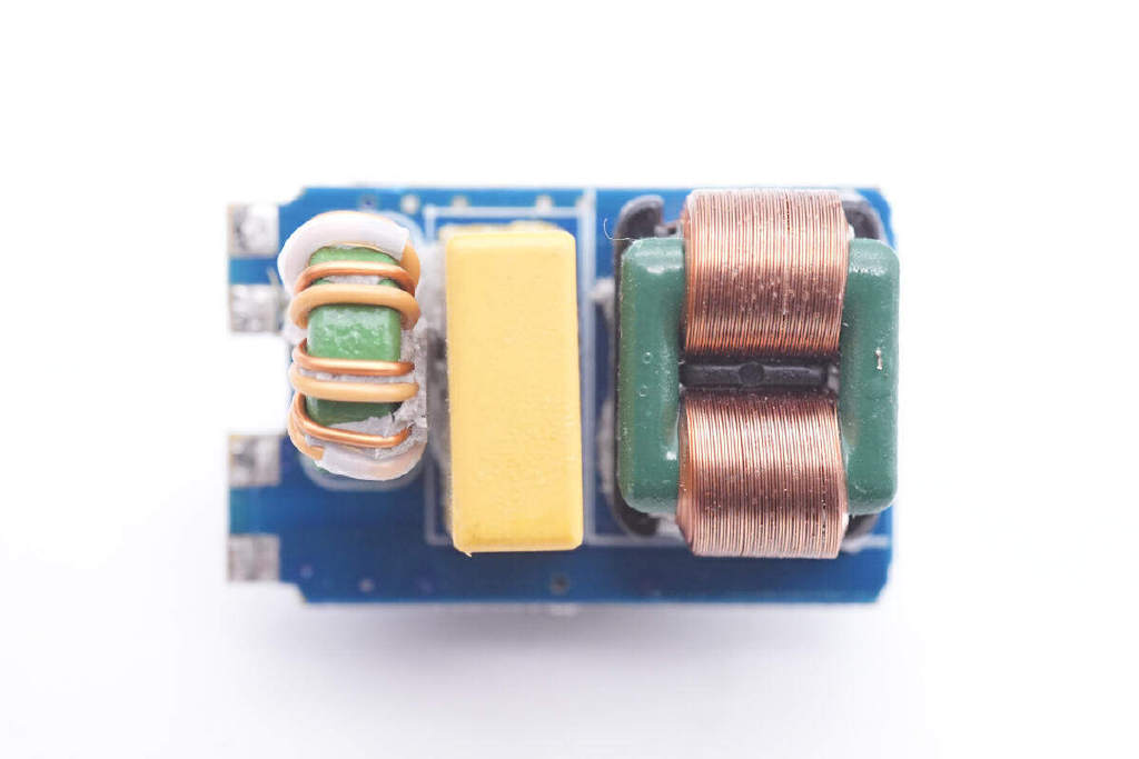 输入端垂直焊接的小板上焊接两级共模电感和安规X2电容。