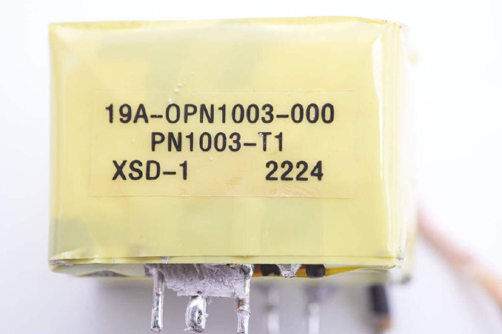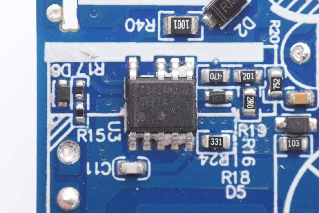 主控芯片采用安森美NCP1342,这是一颗高频反激准谐振初级PWM控制器,内置主动X2电容放电、支持宽范围Vcc供电、支持外接热敏电阻进行过热保护和多重完善的保护功能。在主控芯片左侧是一颗热敏电阻,用于检测充电器内部温度,进行过热保护。