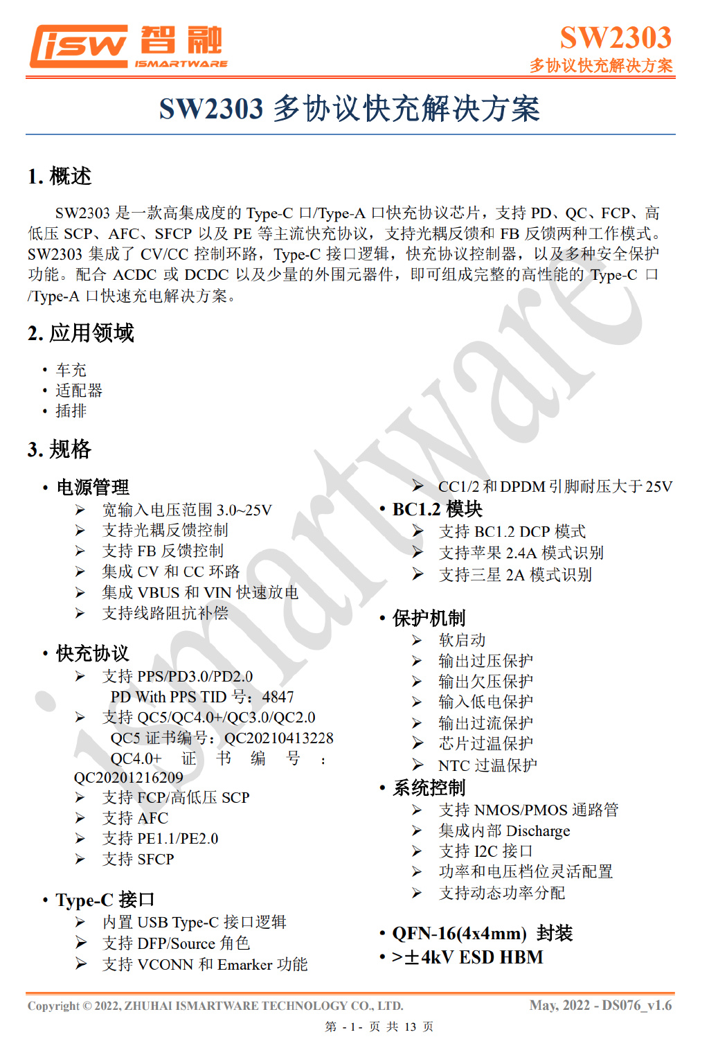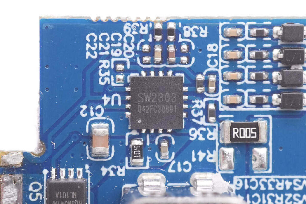 这款充电器内置的协议芯片为智融SW2303,这是一款高集成度的 Type-C 口/Type-A 口快充协议芯片,支持 PD、QC、FCP、高低压 SCP、AFC、SFCP以及PE等主流快充协议,支持光耦反馈和 FB 反馈两种工作模式。SW2303 集成了 CV/CC控制环路,Type-C 接口逻辑,快充协议控制器,以及多种安全保护功能。配合 ACDC 或 DCDC 以及少量的外围元器件,即可组成完整的高性能的Type-C 口/Type-A 口快速充电解决方案。