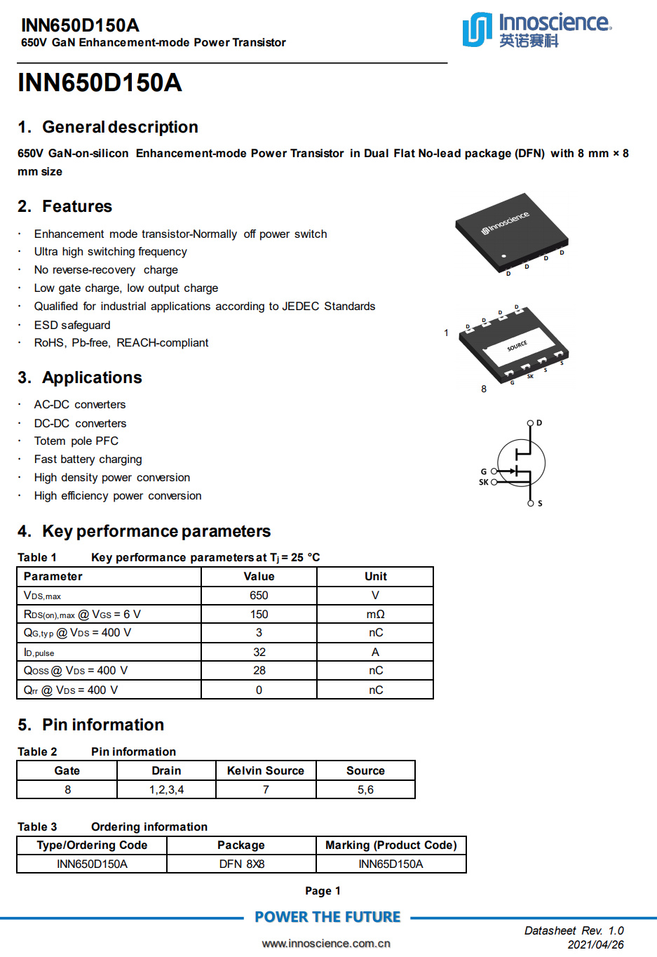 INN650D150A支持AC-DC,DC-DC转换器应用,支持图腾柱PFC应用,支持电池快充,高功率密度和高能效转换应用。