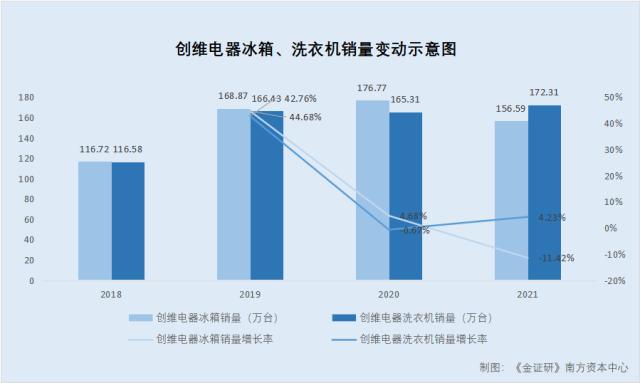 据招股书及2021年招股书,2018-2021年,创维电器冰箱的销量分别为116.72万台、168.87万台、176.77万台、156.59万台,2019-2021年冰箱销量同比增长44.68%、4.68%、-11.42%。