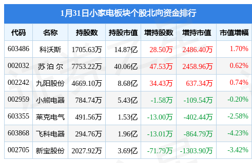 北向资金方面,当日小家电板块北向资金持股市值为69.04亿元,增持0.55亿元。其中增持最多的是科沃斯,增持了0.25亿元。减持持最多的是新宝股份,减持了0.13亿元。小家电板块北向资金持股变动明细见下表: