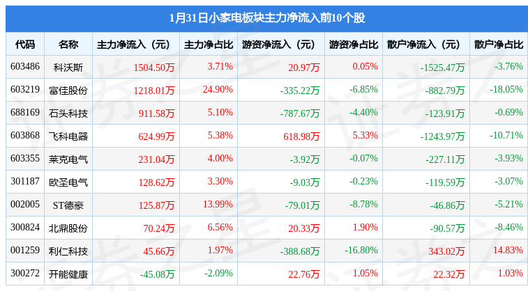 从资金流向上来看,当日小家电板块主力资金净流出5945.58万元,游资资金净流入2530.62万元,散户资金净流入3414.96万元。小家电板块个股资金流向见下表: