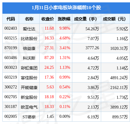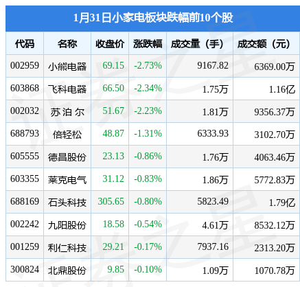 1月31日小家电板块较上一交易日下跌0.6%,小熊电器领跌。当日上证指数报收于3255.67,下跌0.42%。深证成指报收于12001.26,下跌0.8%。小家电板块个股涨跌见下表: