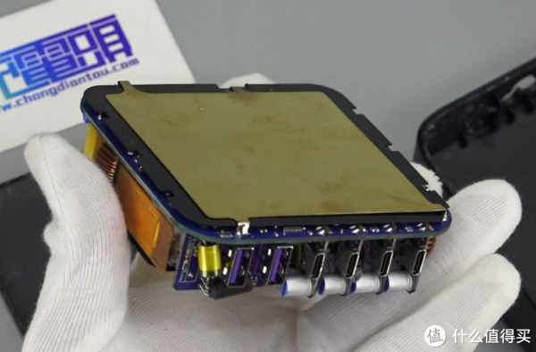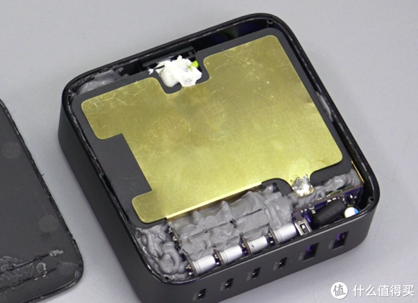 ▲内部前后两块大大的散热铜片(来源:充电头网的拆解视频)入手前做足了功课,连拆解视频都看了,感谢充电头网的精彩视频,让我可以一窥这台绿联充电器的内部,说实话当我看到充电器内部前后两块大大的散热铜片时,一下子对这产品有了充足的安全感与好感,就冲这硬件配置,值得冲了!