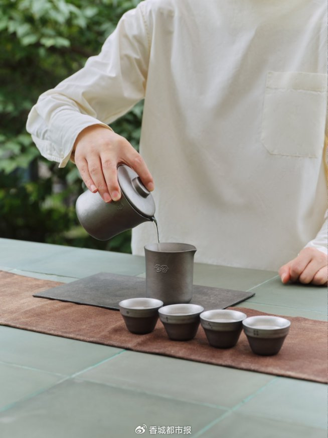打开收纳包的声音短促而干净。茶具层层嵌套着:泡茶杯与杯盖在最外层,公道杯与四只茶杯在内层。每一只器皿都由纯钛制成,质地轻盈。外壁经过哑光凹凸工艺处理,像陶器一样温润;内壁结晶工艺的表面在晨光里微微泛光,平滑得几乎不挂水珠。茶艺师指着那层光泽说,这样的处理能让茶味更干净,也更容易清洗。